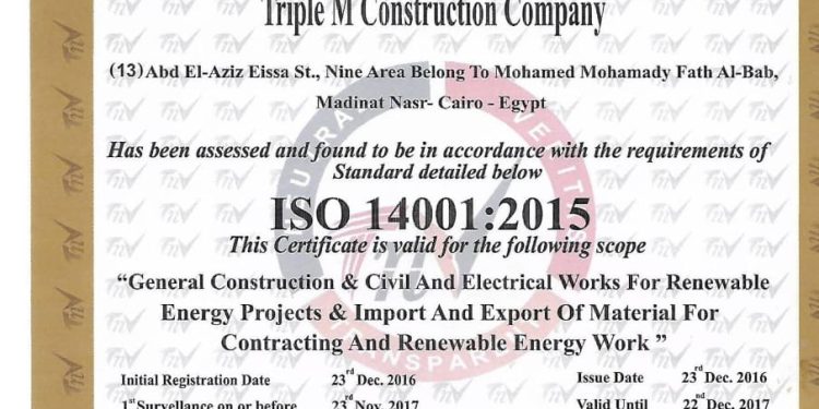 Triple M Construction Co.–Egypt is proud to announce the successful certification of its Health, Safety, and Environmental Management Systems to OHSAS 18001:2007 and ISO 14001:2015 standards. This achievement follows a rigorous independent audit conducted by the Egyptian Assessment Bureau, confirming that the company’s management systems fully comply with the specified requirements. The certification scope includes the Triple M head office, as well as general construction, civil and electrical works for renewable energy projects, and the import and export of materials for such projects.